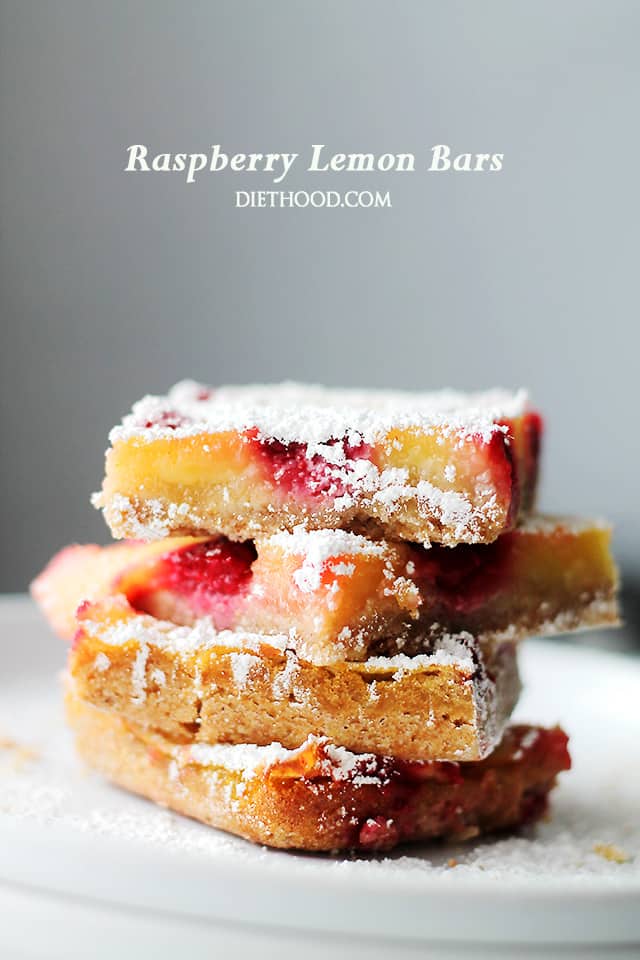 Barras de limón y frambuesa: corteza de waffle de nuez cubierta con un delicioso relleno de limón y salpicada de frambuesas frescas y dulces. Llenas de sabor y textura, estas barras de limón no solo son deliciosas, sino que con 150 calorías por porción, también son mucho más ligeras que la receta clásica de barra de limón. ¡FRUNCIDO!