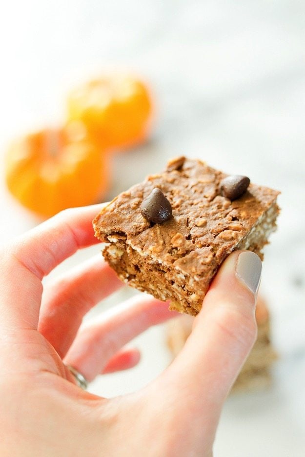 Con harina de avena y proteína en polvo como base, estos barritas de proteina de calabaza No contienen gluten y si usas proteína vegana en polvo también lo son. Tienen un buen sabor a pastel de calabaza, un toque de dulzura y una buena proporción de proteínas/carbohidratos, perfectos para comer antes o después del entrenamiento. O como barra de desayuno para llevar.