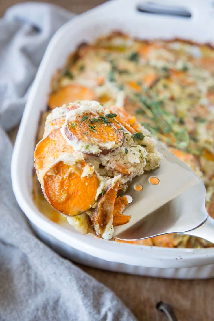 Estas batatas gratinadas son solo eso: son muy reconfortantes, pero no requieren crema, queso ni actividades divertidas. De hecho, la salsa es a base de coliflor. (Cola de registro de trabajos) ¡Sí, coliflor!