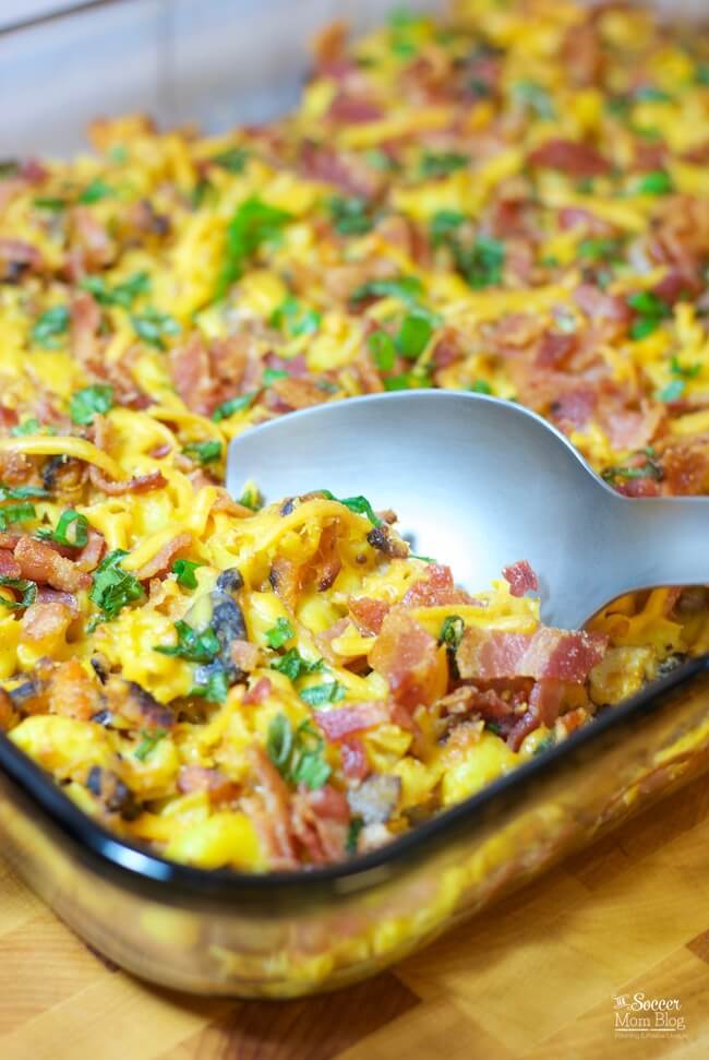 . Cubra con tocino picado y cebollas verdes. Tape y cocine por 30 minutos a 350°. Destape y cocine por otros 10 minutos.