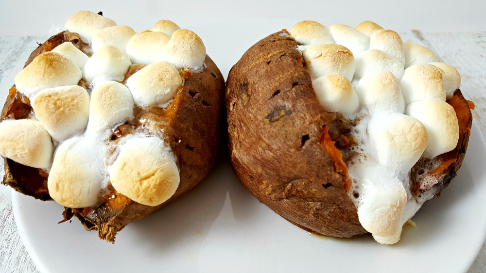 Regrese las batatas al horno y hornee por otros 5 minutos o hasta que los malvaviscos estén dorados.