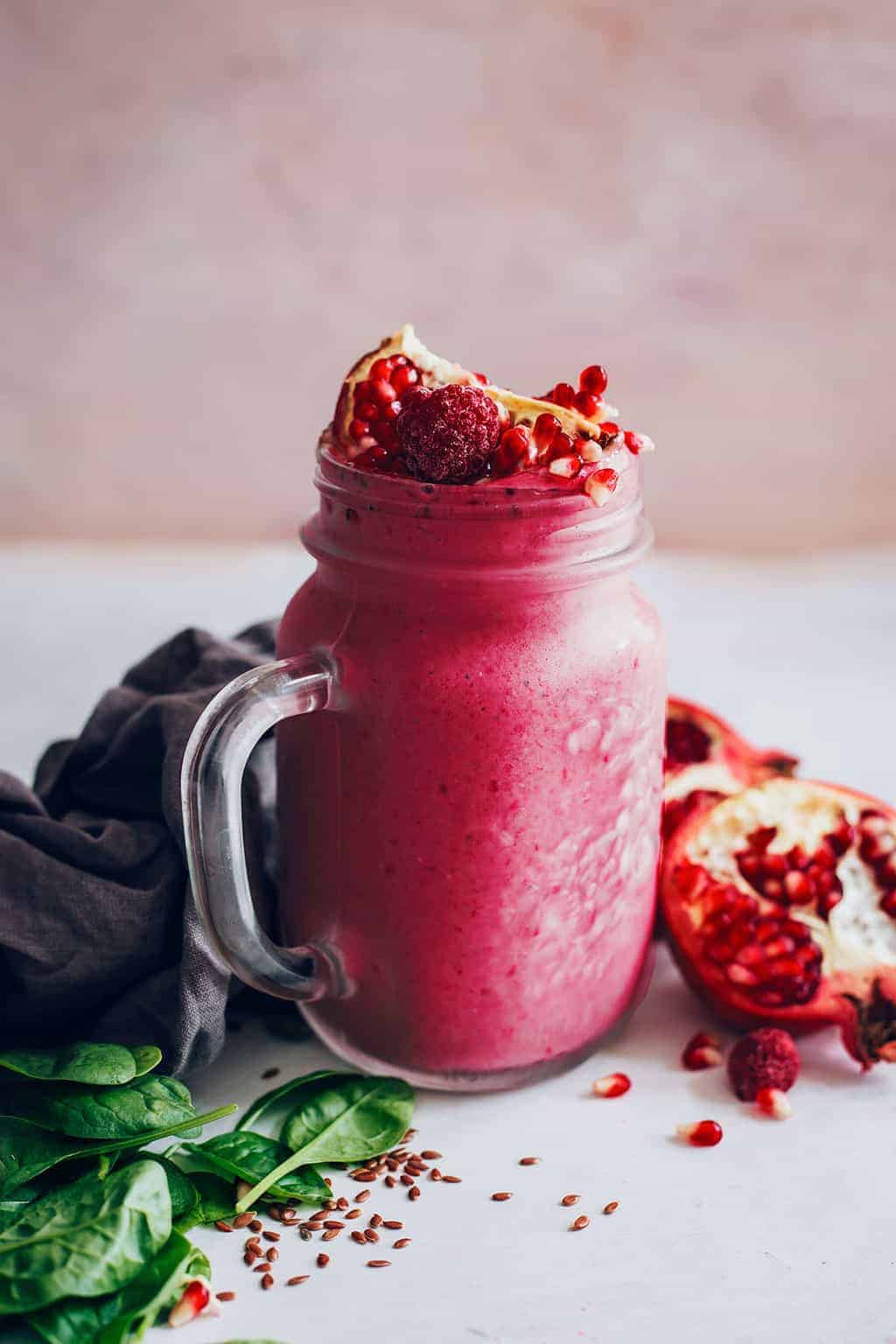 La receta de hoy es un batido maravilloso, delicioso y súper saludable que planeo beber mientras las granadas están en temporada. ¡Porque sí, las granadas son las protagonistas de esta receta!