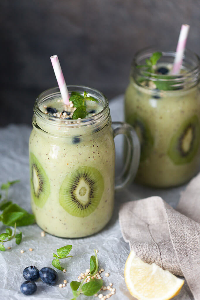 - En un frasco de vidrio, coloque unas rodajas de kiwi en la pared de vidrio y empújelas suavemente hacia el interior del vidrio para que hagan buen contacto. Vierta el batido y rocíe con arándanos, hojaldres de quinoa y hojas de menta. Atender.