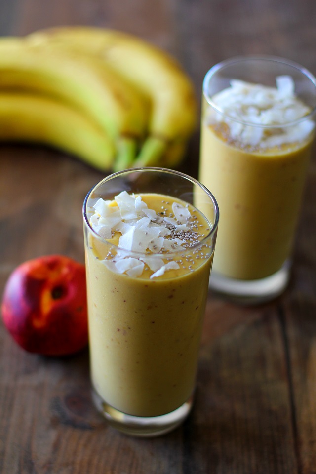 No todos los sábados publico una receta, ¡pero este batido es demasiado bueno para no compartirlo! Los mangos y los duraznos son dos de mis batidos favoritos. Mezclarlos con leche de coco es una excelente manera de levantarse y brillar.