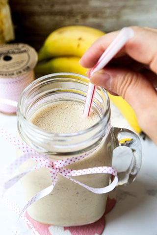 Ah, y este batido de plátano y mantequilla de maní también es muy fácil de hacer. ¡Déjame mostrarte cómo hacerlo en la cocina de tu casa en menos de 5 minutos!