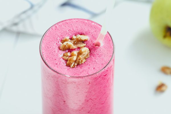 3. Deje reposar la mezcla 1 minuto antes de servir. decorar el batido de remolacha y manzana con nueces encima. ¡Gustar!