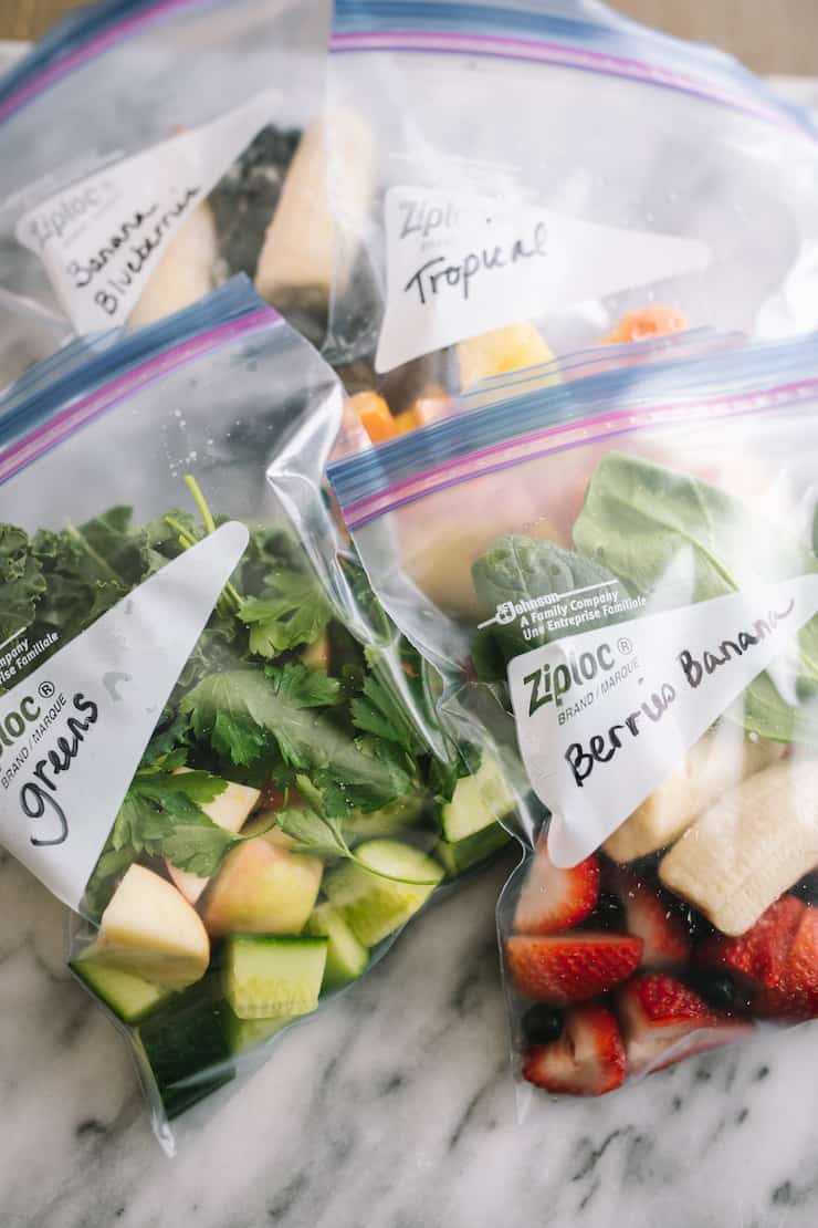 Tengo algunas combinaciones de batidos favoritas que me encanta preparar y almacenar en mi congelador en bolsas de plástico para un comienzo saludable y sin excusas para mi día.
