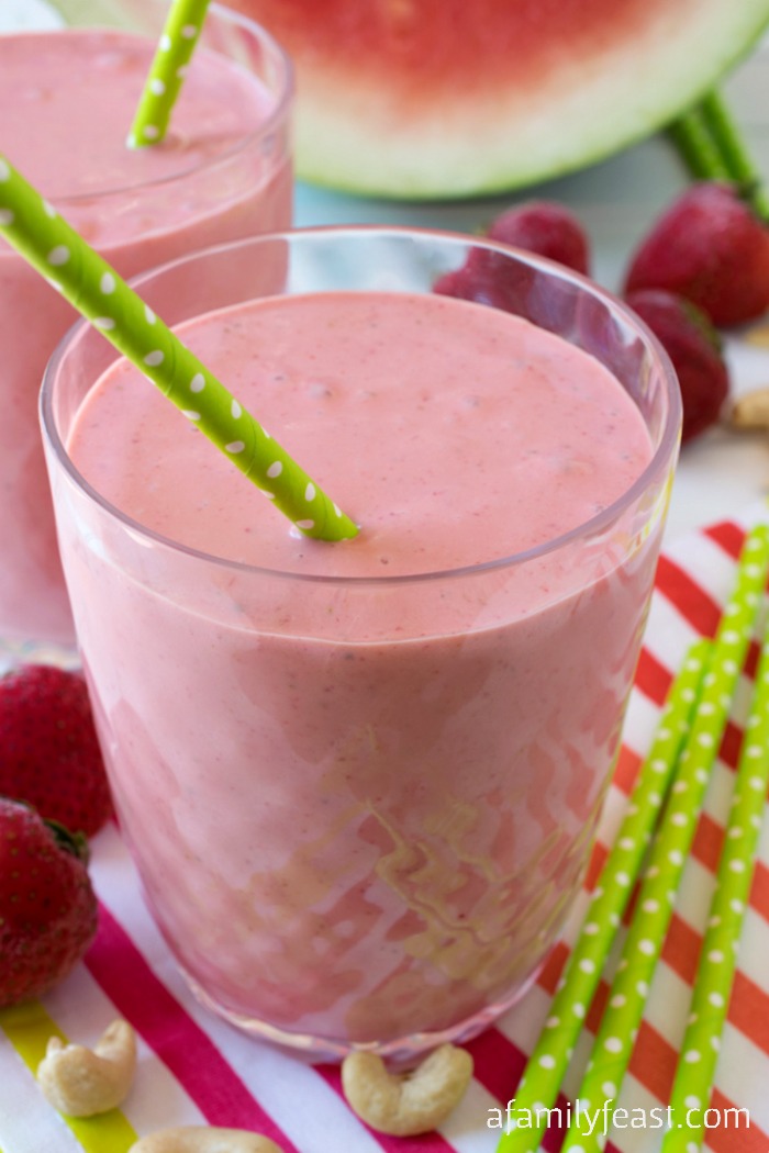 Principalmente usamos sandía y fresas en los batidos y paletas de sandía de hoy en día; realmente puede usar cualquier mezcla de frutas frescas u otra mezcla de frutas congeladas que desee. Simplemente mezcle todos los ingredientes y tendrá un excelente batido para el desayuno o un postre saludable.
