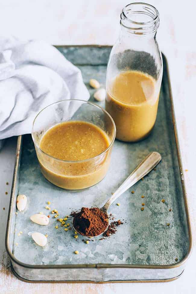 Esto también incluye agregar ingredientes adaptogénicos para ayudar a mi cuerpo a adaptarse y aceptar los cambios a lo largo del mes. Este batido es un elixir hecho con mis hongos adaptogénicos favoritos y otros ingredientes clave para apoyar la transición durante la fase lútea.