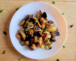 Para hacer esta sencilla receta de cuatro pasos, comience echando pequeños trozos de berenjena en la maicena hasta que estén ligeramente cubiertos. Coloque la berenjena en una sartén antiadherente con aceite de canola y saltee a fuego medio durante unos ocho minutos. Cuando la berenjena esté suave, retírala de la sartén. Saltea el ajo picado y las cebolletas en rodajas durante unos dos minutos, regresa la berenjena a la sartén y reduce el fuego a medio. En un tazón pequeño, prepare la salsa combinando salsa de soya baja en sodio, agua, azúcar, maicena y jengibre molido. Vierta la salsa sobre la mezcla de berenjena y cocine hasta que la salsa se espese.