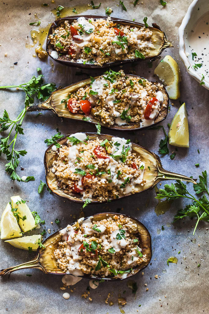 Las berenjenas rellenas de cuscús cubiertas con lima fresca y salsa tahini son una manera deliciosa de servir las berenjenas. ¡Vegano y sin lácteos!