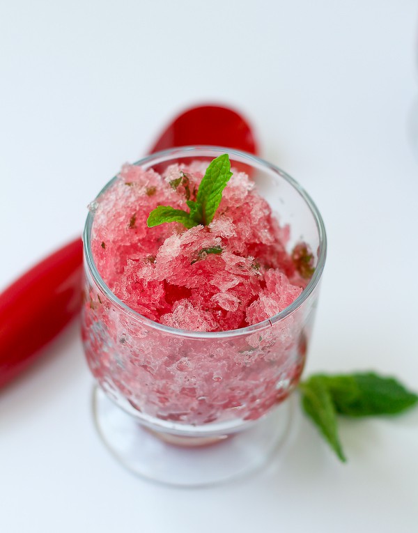 Si nunca antes has hecho un granizado, es súper fácil. Encuentra una bandeja para hornear que quepa en tu congelador. Usé una bandeja de 9 x 9 pulgadas, pero una bandeja de 9 x 13 pulgadas también funcionaría y realmente te gustaría disfrutar de esa baba incluso antes. Si el espacio del congelador es limitado, un molde para pan también funcionará, pero asegúrese de darle más tiempo para que se congele, ya que estará en una capa más gruesa. Mezcla los tres ingredientes, puedes hacerlo directamente en el plato donde vas a congelar. ¡Y luego ponlo en el congelador! Cada 30 minutos lo sacarás del congelador y lo rasparás con un tenedor, removiendo los bordes congelados en el centro de la sartén. Continuarás haciendo esto hasta que esté completamente congelado en pequeños copos que se derriten en tu boca, liberando los fantásticos y refrescantes sabores de las bayas, la menta y el ron.