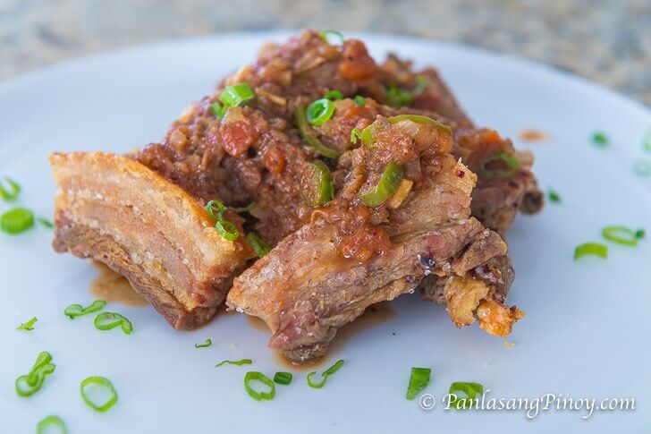 Panceta de cerdo crujiente cubierta con salsa binagoongan. Este plato se sirve mejor con arroz.