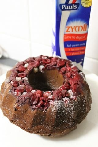 Espolvorea las nueces de macadamia y las frambuesas en la bandeja para hornear y agrega la mezcla para pastel. Cocine durante 20-30 minutos o hasta que un palillo salga limpio. Enfríe el pastel en el molde durante unos 10 minutos, luego déle la vuelta al pastel sobre una rejilla. Para servir, espolvorear con azúcar impalpable.