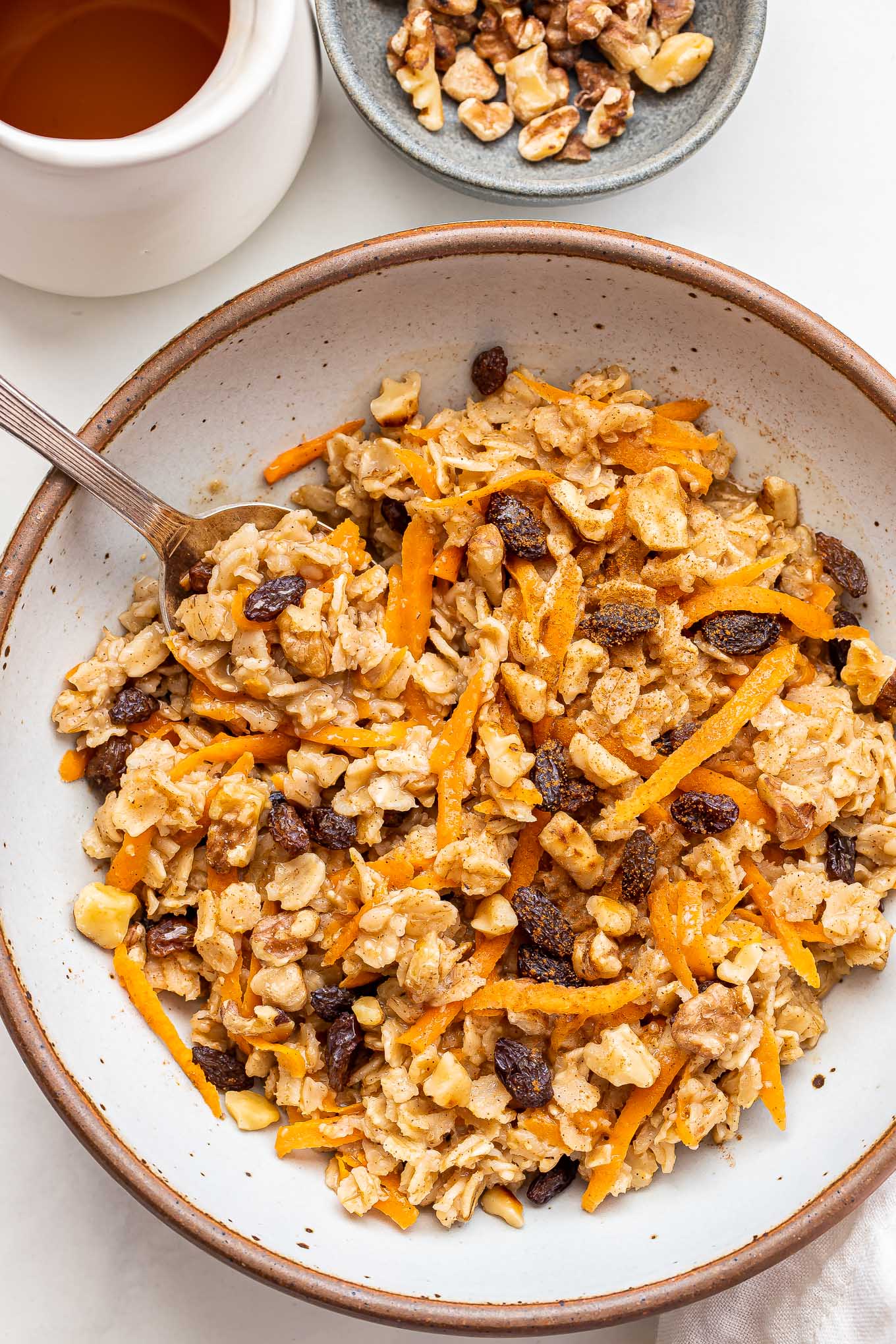 ¡Un tazón caliente y dulce de avena que sabe como si tuvieras una rebanada de pastel de zanahoria para el desayuno!