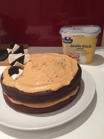 Para montar la tarta, corta la tarta de chocolate por la mitad de forma horizontal. Poner un poco de nata montada con caramelo salado por fuera y una crema espesa de vainilla en el medio. Corta 1 plátano y agrégalo a la crema. Vuelva a colocar la parte superior del pastel y decore con chispas de chocolate, si lo desea.