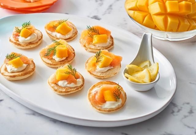 Deje enfriar y cubra los blinis con crema agria, mango picado, tiras de salmón ahumado y ramitas de eneldo.