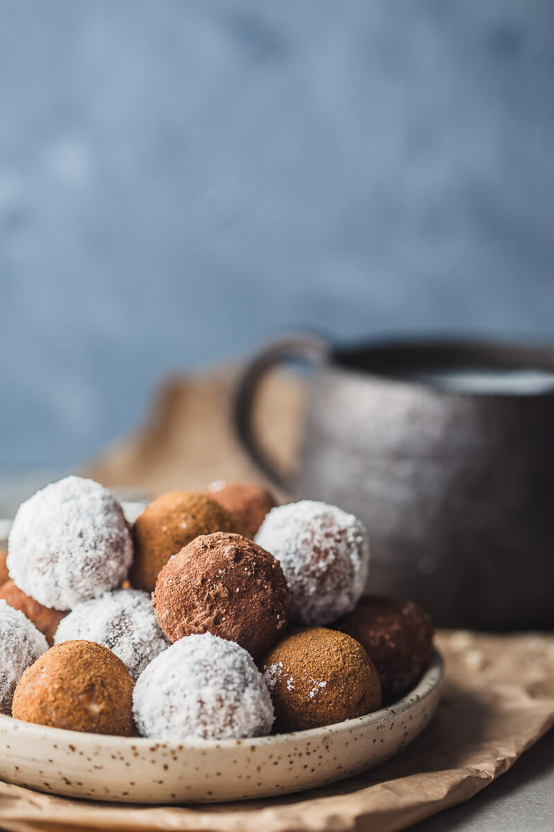 - Prepara tus decoraciones en platos separados. Tome una bola de energía y pásela por harina de coco, cacao en polvo o canela hasta que esté completamente cubierta y colóquela de nuevo en un plato o tazón.