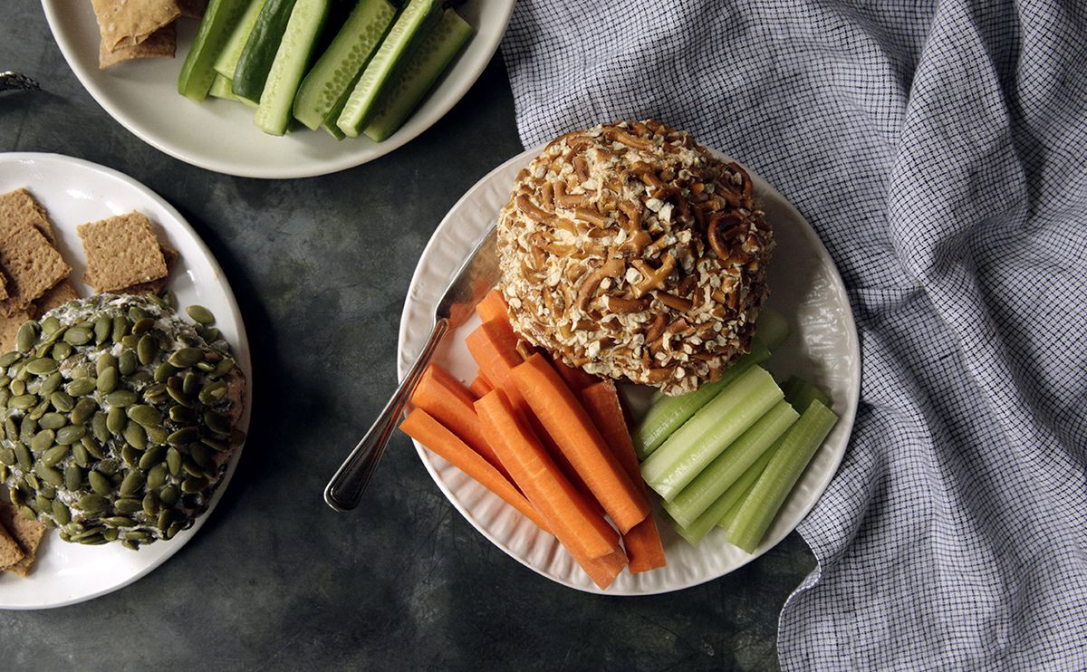 Retire la bola de queso de la nevera y forme una bola. Triture una cantidad significativa de pretzels y, en una bandeja para hornear, haga rodar la bola de queso en los pretzels para que quede completamente cubierta. Sirva con apio y zanahorias.
