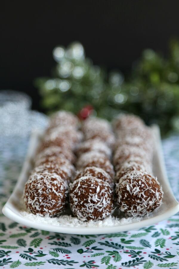 Estas bolas de ron paleo son fáciles de hacer y perfectas para intercambiar galletas navideñas. Un puñado de ingredientes se coloca en el procesador de alimentos, luego se enrollan en bolas y se dejan caer en el coco.