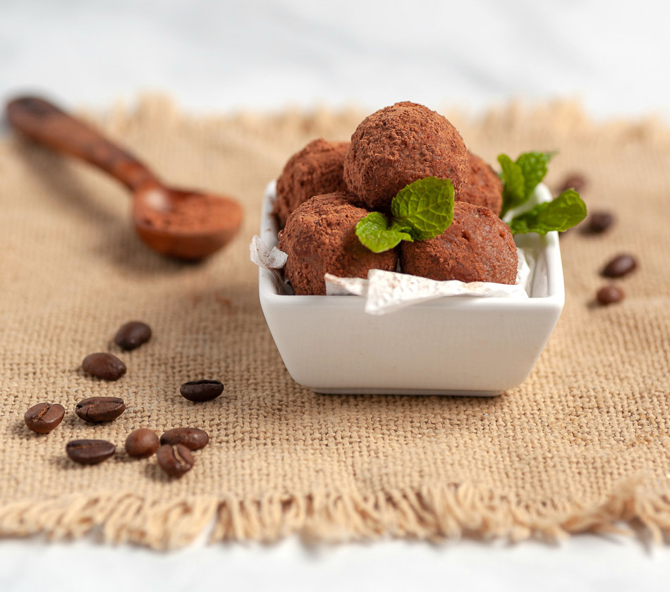 - Enrolle cada bola en la capa de cacao en polvo y edulcorante y sirva.