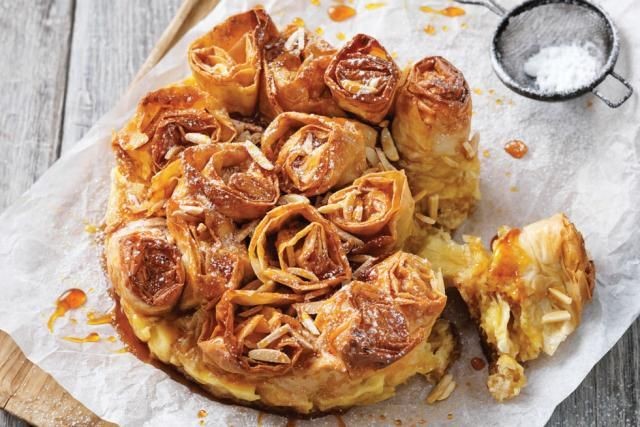Coloque la masa sobre la mesa y cúbrala ligeramente con un paño húmedo para evitar que la masa se seque y se agriete. Extienda 1 hoja de pasta filo con mantequilla. Dobla a lo largo en 3 (como un sobre). Envuelva una tira larga para crear una roseta. Repita con el resto de la masa y más mantequilla. Coloque las rosetas de hojaldre, en posición vertical, en la sartén. Cepille generosamente con la mantequilla restante encima y cocine durante 30 minutos o hasta que estén doradas y crujientes.