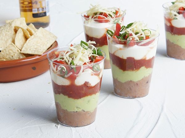 En un recipiente grande y hondo, coloca los frijoles, la salsa de guacamole, la salsa de tomate, la crema agria y la mayonesa, los tomates picados, el cebollín y termina con el queso rallado.