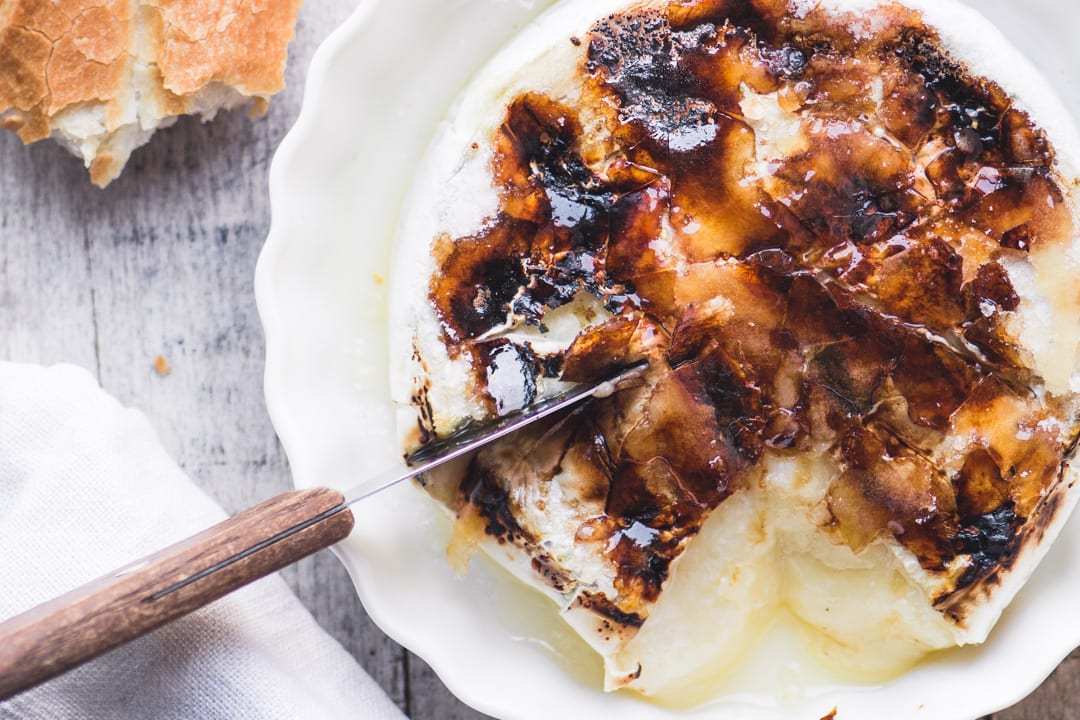 Deje que se enfríe durante uno o dos minutos, luego la capa caramelizada se endurece. Sirva el Brie con galletas saladas o una baguette fresca de inmediato.