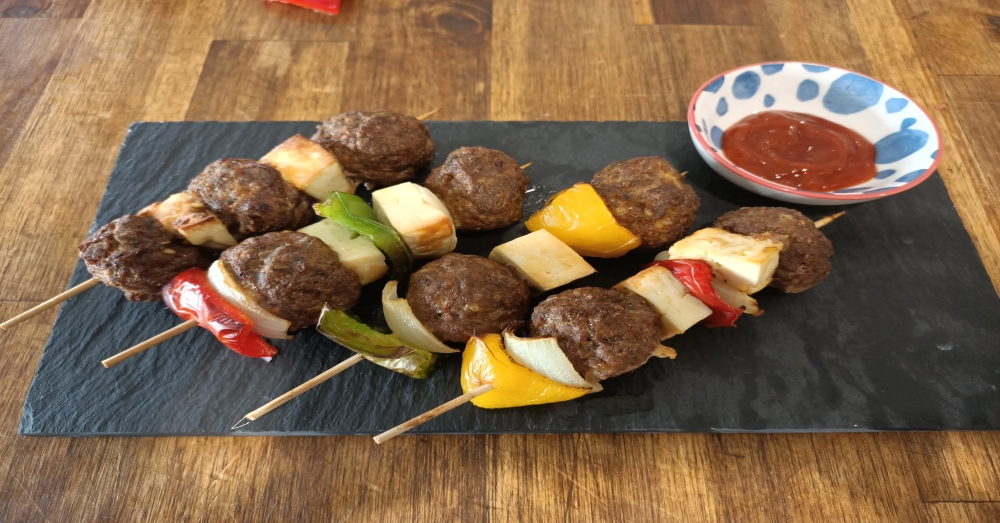 Esta receta de albóndigas de brocheta de carne es una de mis favoritas absolutas para cocinar en casa. Va bien con albóndigas picantes y sabrosas con halloumi (mi queso favorito), pimientos y cebollas. Halloumi es un excelente queso para freír al aire porque es más firme que la mayoría de los demás. Eso significa que obtienes un queso más dorado y crujiente sin el desorden y el caos de los quesos más oscuros, y también permanece en las brochetas.