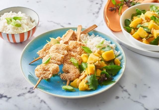 Sirva brochetas espolvoreadas con semillas de sésamo adicionales, junto con mango asiático y arroz o ensalada de pasta (opcional). Decorar con cebolla tierna.