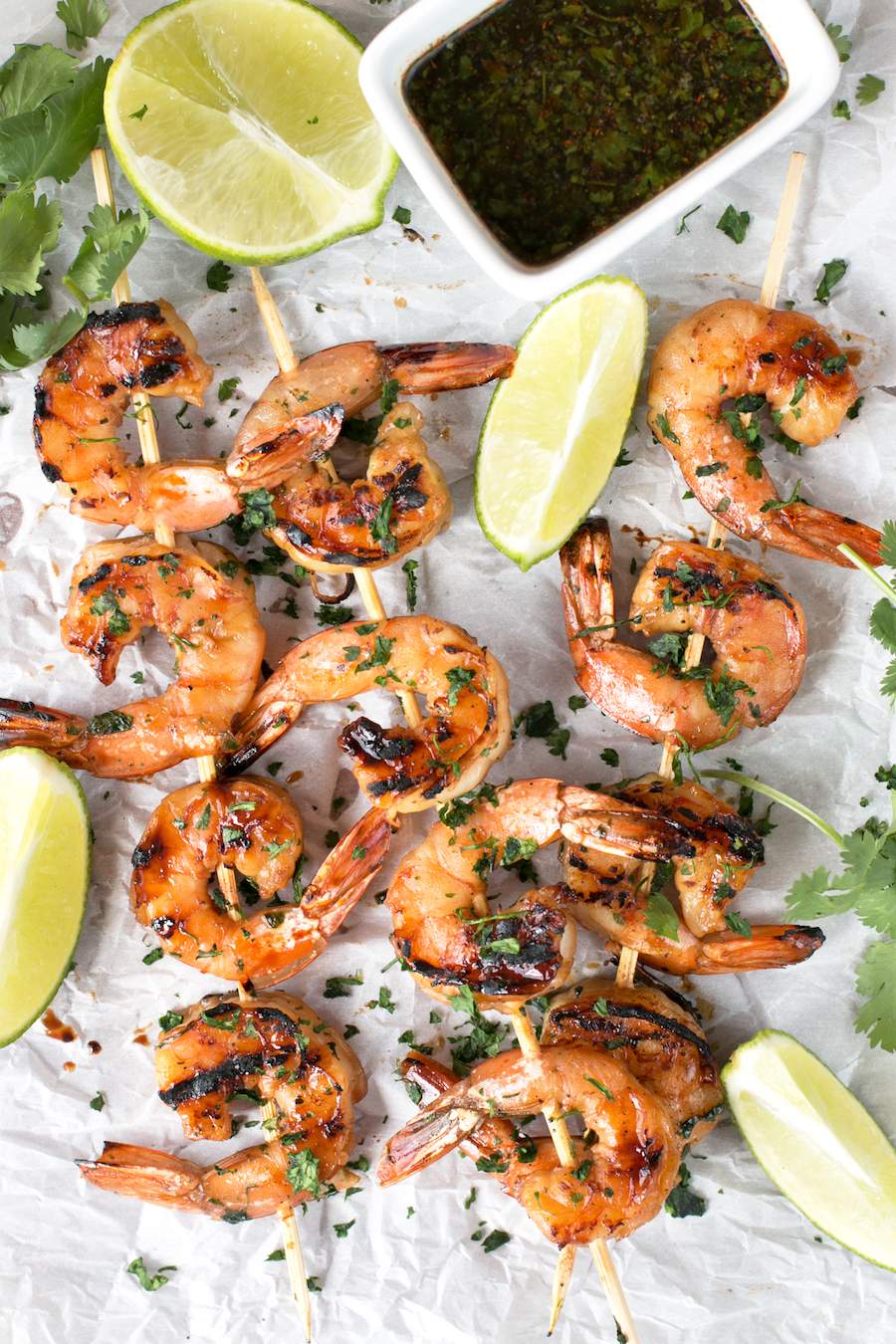 Las brochetas de camarones con cilantro y agave se pueden servir como aperitivo o como receta para la cena.