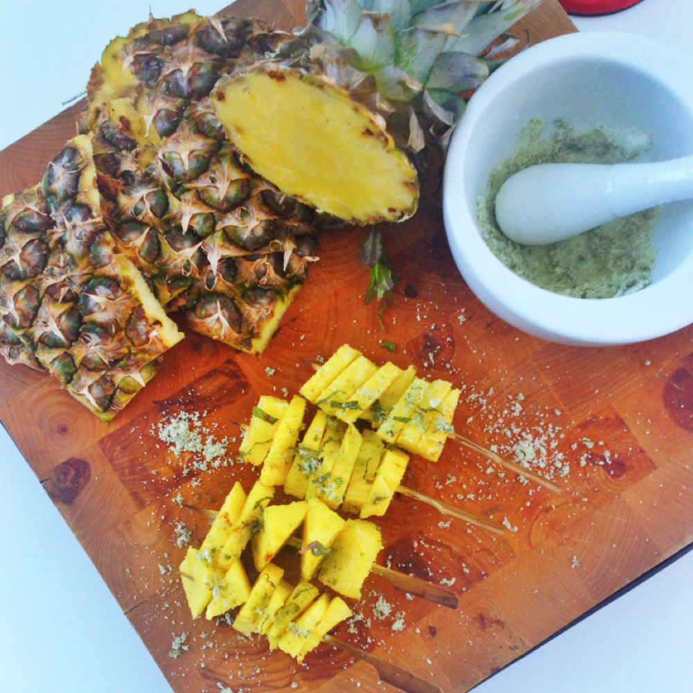- Deslice los trozos de piña en los palitos de kebab y frótelos con el azúcar de menta (vea la receta a continuación)