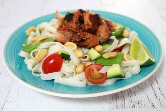 Cocine los fideos de arroz según las instrucciones del paquete. Escurrir los fideos de arroz y lavar con agua fría. Coloque los fideos en un tazón grande.