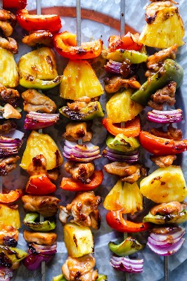 Estos kebabs de pollo a la parrilla hawaianos son un toque tropical en el pollo teriyaki. Una salsa teriyaki de piña y cítricos complementa estas brochetas de pollo y vegetales, perfectas para asar a la parrilla entre semana o cocinar los fines de semana.