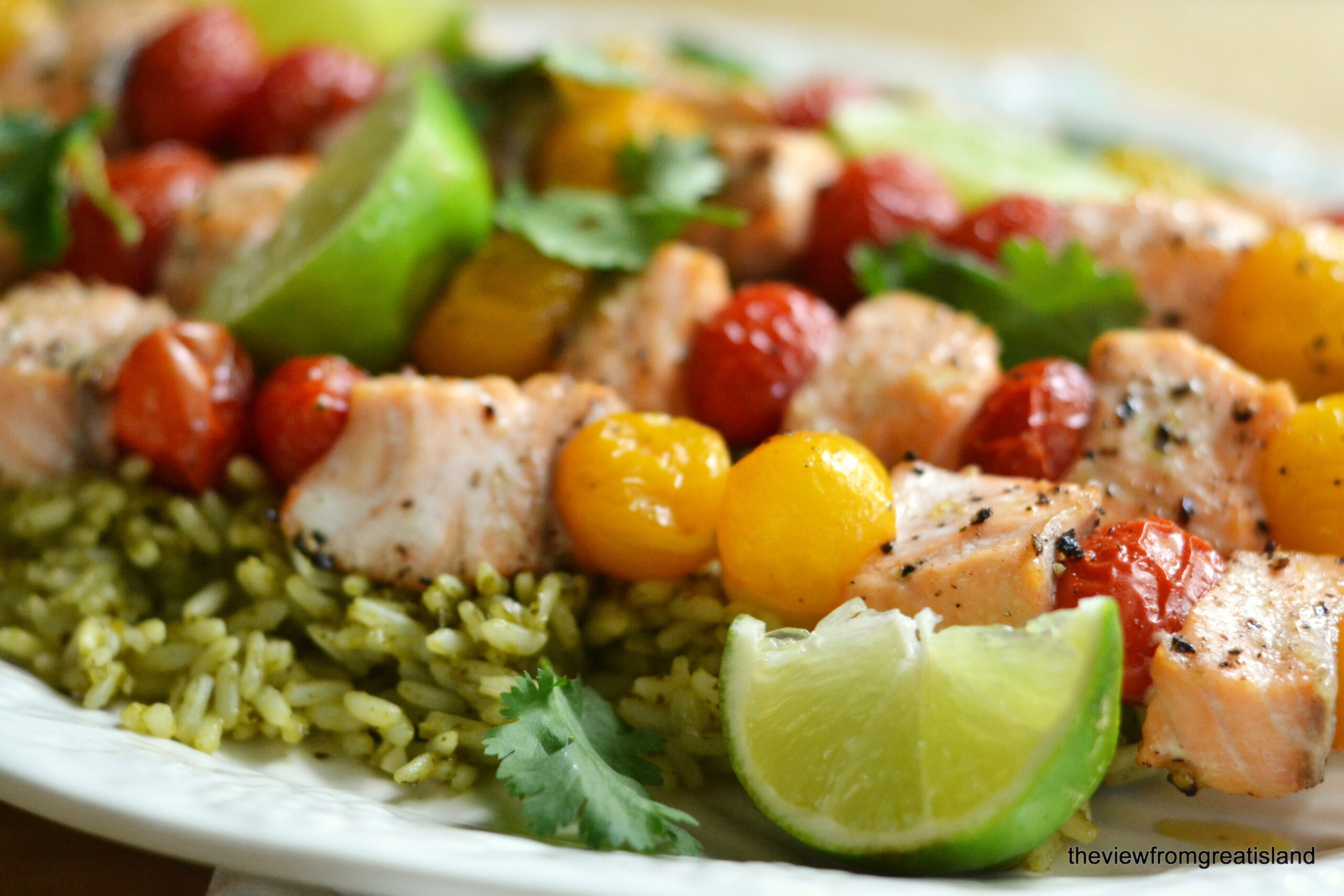 Estas brochetas de tomate cherry y salmón fueron la cena de ayer. Envolví trozos de salmón en brochetas, alternando con coloridos tomates cherry. Un chorrito de aceite de oliva, una buena pizca de sal y pimienta, 10 minutos en horno caliente a 450F y listo. El arroz no es solo una ocurrencia tardía, es brillante y lleno de sabor por sí solo.