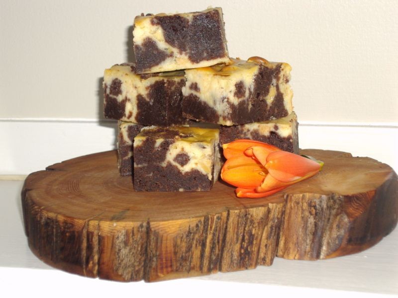 En una lata forrada en rodajas, mezcle la mezcla de brownie y cheesecake alternativamente.