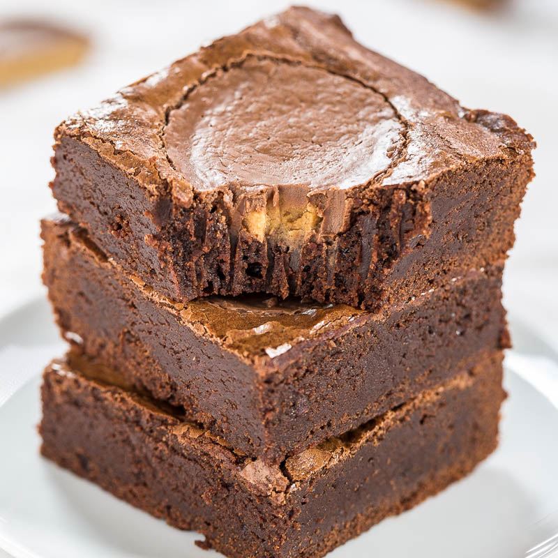 Los brownies son ultra peludos, sin pastel, ridículamente ricos, chocolates audaces, y hay una taza de mantequilla de maní para cada brownie. La mantequilla de maní y el chocolate son una combinación perfecta y cada brownie tiene su propia taza de mantequilla de maní. No escatime aquí. Es una receta rápida, sin tazón y sin licuadora que es tan simple como usar una mezcla. Cuando muerdes el decadente y peludo brownie y la suave, salada y dulce taza de mantequilla de maní, es un bocado perfecto.