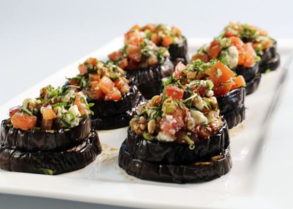 Coloque 8 rodajas de berenjena en un plato, cubra cada una con una segunda ronda. Vierta la mezcla de tomate en la berenjena caliente. Cubra con la menta restante, rocíe con aceite de oliva virgen extra y vinagre balsámico.