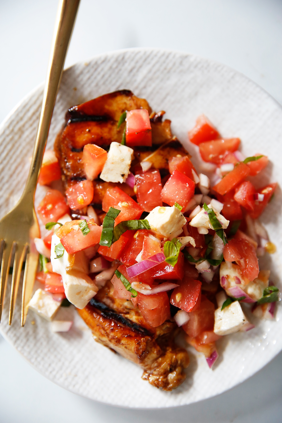 Esta Bruschetta de pollo es perfecta en cualquier época del año, ya que puedes encontrar tomates maduros en el invernadero durante todo el año. Sin embargo, esto es especialmente importante durante la temporada de asado cuando los tomates frescos se cultivan en todas partes. Es la comida cruda perfecta cuando el clima requiere que cocines y comas afuera. El pollo se marina a la perfección, se asa a la parrilla y se cubre con una deliciosa bruschetta de tomate fresco. Es perfecto solo, pero puedes servirlo con una ensalada ligera o pasta si lo deseas. Este plato ya no es sin gluten ni bajo en carbohidratos, pero guarde el queso para una comida Whole30 o paleo.