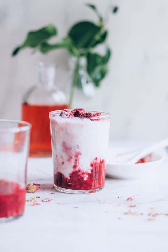 Entonces, sobre este hermoso pudín rosado. Quería hacer un postre ligero que fuera vegano y sin gluten, y que además tuviera propiedades curativas digestivas. Usé polvo de arrurruz para espesar la leche de coco, pero puedes usar maicena si lo prefieres. La adición de puré de frutas lo hace más atractivo visualmente, además de agregar un sabor afrutado que complementa el sabor del agua de rosas.