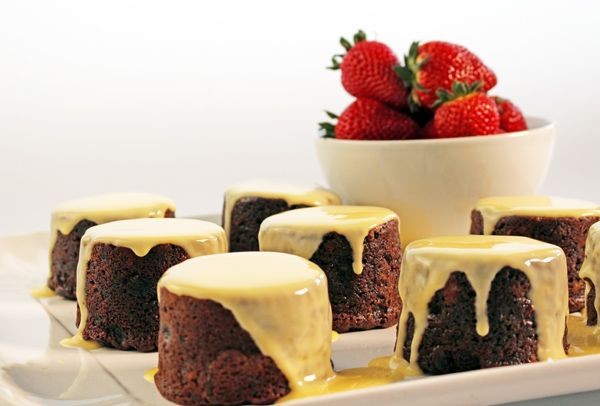 Ponga a un lado durante 10 minutos en una sartén antes de convertirlo en una parrilla. Servir los budines calientes con crema pastelera caliente y fresas.