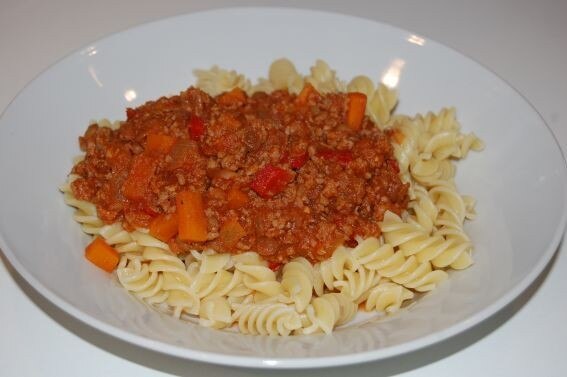 Servir con arroz al vapor o pasta. Yo uso salsa de pasta de pimienta Dolmio.