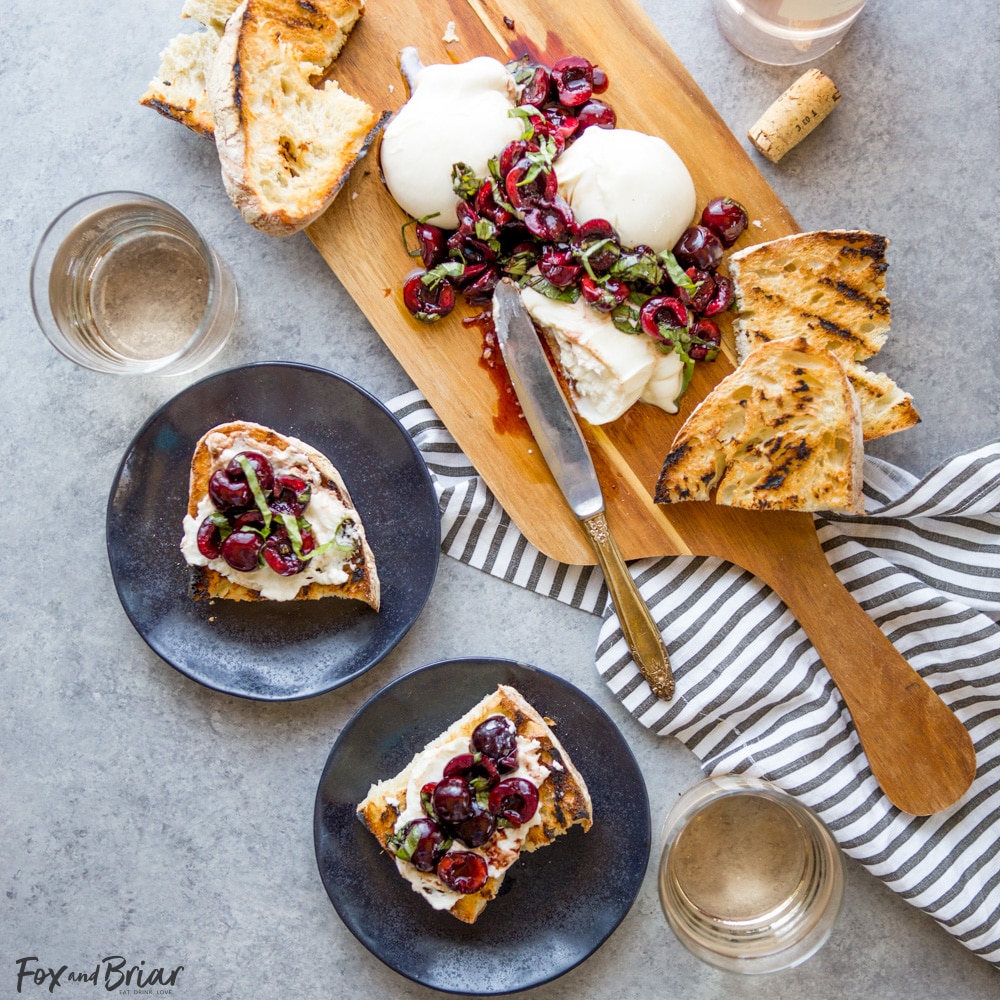Esta burrata con cerezas balsámicas y albahaca está inspirada en un restaurante local y casi podría tenerla para cualquier comida durante el verano. La burrata es fría y cremosa, por lo que combinada con cerezas y albahaca es excelente para un día caluroso. Servir con unas rebanadas gruesas de pan tostado y una copa de rosado frío y listo.