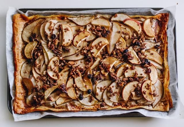 En la quinta hoja de la cuchilla, unte la mantequilla y coloque las rodajas de manzana y pera. Agregue la mezcla de nueces restante, cepille con la mantequilla restante y espolvoree con azúcar de coco. Hornee en el horno durante 20 minutos o hasta que los bordes estén crujientes y dorados.