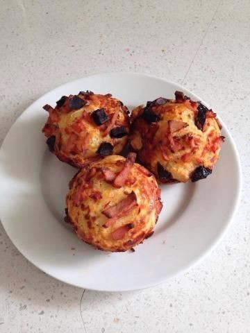 Vierta la mezcla en el molde para muffins preparado. Cubra cada bollo con una cucharada de puré y espolvoree con queso extra, aceitunas y salami.