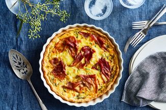 Los quiches son excelentes para servir durante las fiestas porque son muy fáciles y rápidos de preparar. ¡Me encanta esta versión porque está rellena de jamón, salvia fresca y calabaza tostada! -kerstin