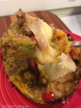PASO CINCO Coloque el relleno sobre las mitades de calabaza y agregue la cantidad deseada de queso. Cocine durante 10-15 minutos hasta que el queso comience a derretirse.