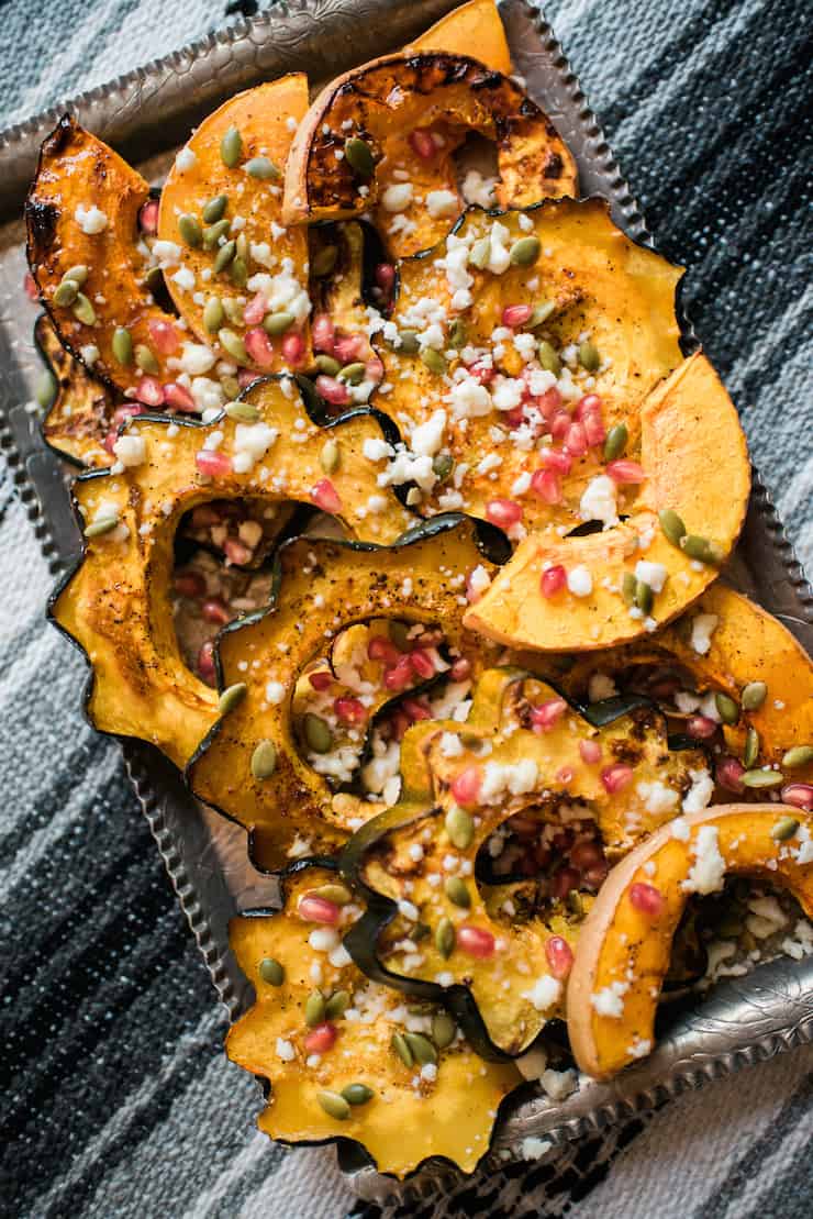 Una vez que la calabaza se asa con jarabe de arce, da una deliciosa capa caramelizada. Adorne con requesón, semillas de granada y nuggets para darle un toque festivo.