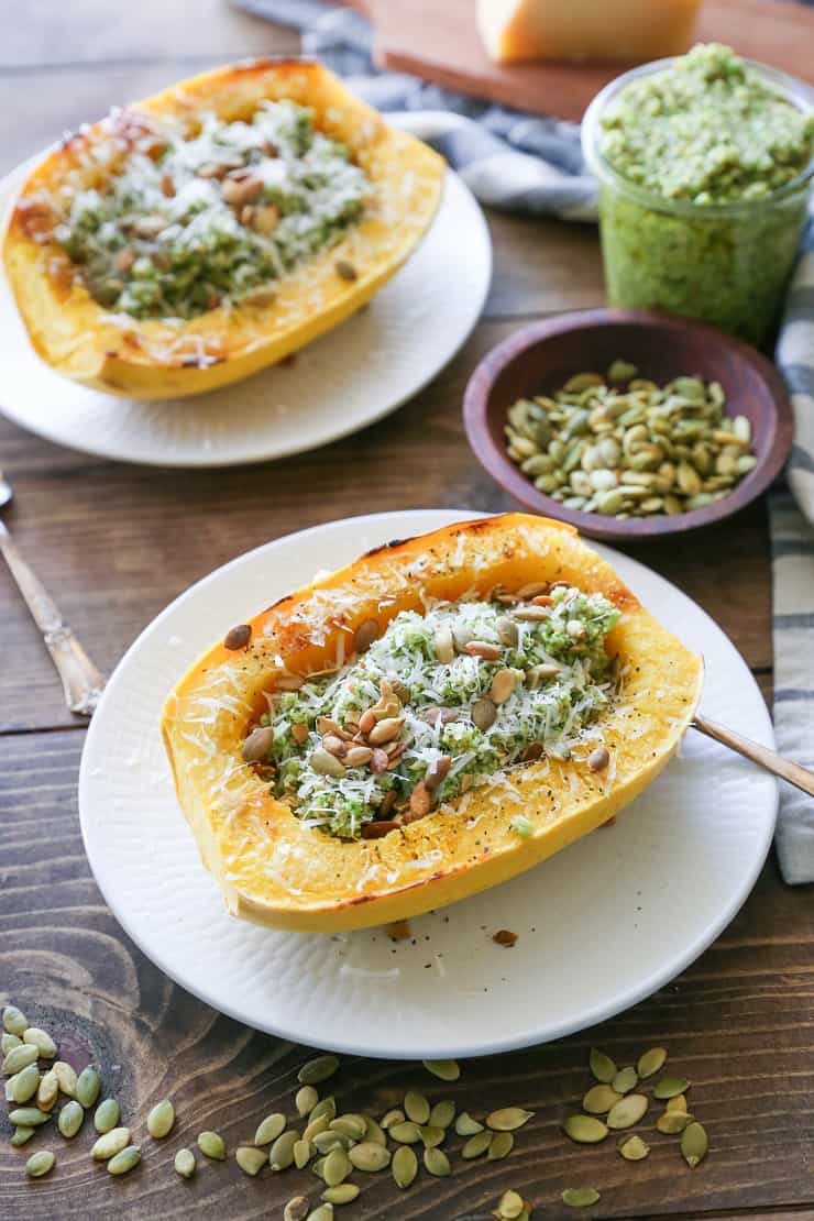 Hablemos del pesto de brócoli por un segundo caliente. SAWEET ramalamadingdong, nunca pensé que el brócoli sería un buen pesto en un millón de años… lo hace amigos De verdad, con locura, profundamente, sí. Tanto es así que hice esta comida exacta 5 de 7 días consecutivos hasta que se acabó todo el pesto. Lo que me lleva al siguiente punto: la receta de brócoli con pesto de semillas de calabaza es suficiente para 3-4 calabazas espagueti (para un total de 6 u 8 mitades de calabaza espagueti). Puedes hacer la cena de 6 a 8 o hacer lo que hice yo y comer pesto toda la semana. O puede guardar el pesto en un recipiente hermético y guardarlo en el congelador para usarlo en el futuro.