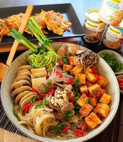 Para servir: Coloque 1/4 de los fideos en tazones individuales, coloque 1/4 de la carne y las verduras encima, sazone el caldo y reparta entre los tazones, agregue el tofu frito y decore con pimiento rojo y cebolla tierna.